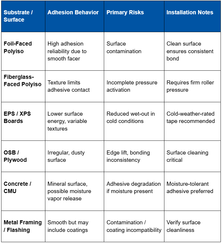 Adhesion success depends heavily on surface characteristics. Installers choosing the best tape for foam board insulation must evaluate facer composition, texture, cleanliness, and surface energy before selecting a seam treatment strategy.